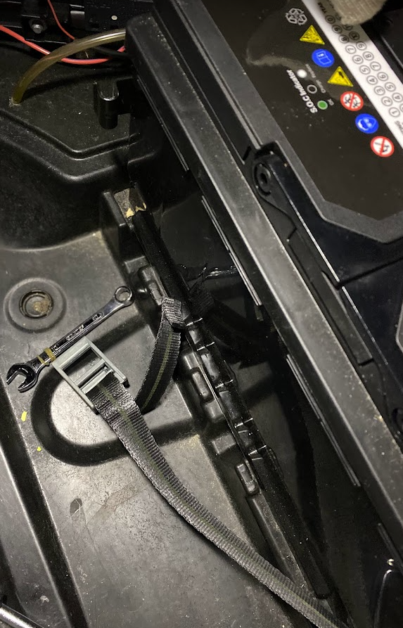 6) 오른쪽 사진의 위쪽에 보면, 배터리에 연결된 호스가 있습니다. 살짝 빼주시면 되고, 배터리를 잡고 있는 옆면의 스트랩도 풀어 줍니다.