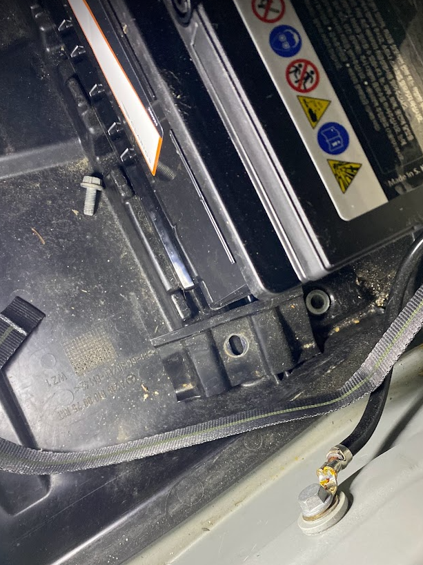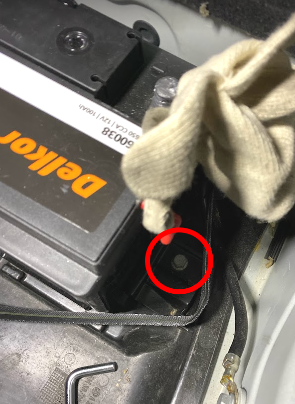 7) 마지막으로 마이너스 단자 안쪽 아래에 배터리를 고정하고 있는 볼트가 하나 있습니다. 13mm 이며, 안쪽에 있어서 T자형 렌치가 필요 합니다. 풀고나면 오른쪽 처럼 배터리를 고정하는 커버가 풀리고, 배터리를 안전하게 탈거할 수 있습니다.