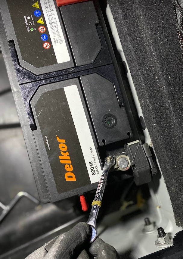 2) 10미리 스패너 (혹은 렌치)로 아래쪽의 마이너스 단자 부터 풀어 줍니다.