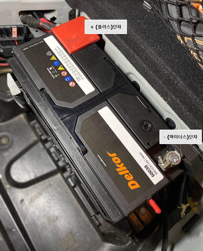 1) 시동을 끄고, 트렁크 바닥 커버를 들어내어 차량 오른쪽의 배터리 위치 및 단자 위치를 확인 합니다.