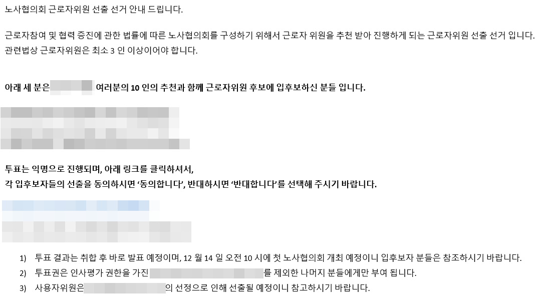 선거 관련 문항은, "근로자위원 ***님의 선출에 대한 의견"으로 질문하고, "찬성합니다" 혹은 "반대합니다"의 답변을 선택하도록 만들었습니다. 추천된 후보자 수만큼 각각에 대해 질문을 만들어 진행했으며, 다수의 득표를 얻는 후보자를 우선 순위로 선출하기로 결정 했습니다.
