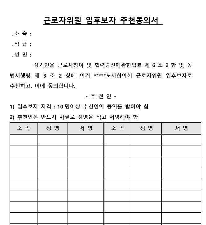권유된 근로자위원 후보자가 후보 등록을 동의한다면, 아래와 같이 간단한 참조 양식을 참조하여 노사협의회 입후보자 추천서를 10명의 동의 후 제출하면 됩니다.