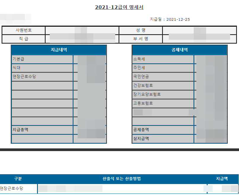 - 임금명세서는 개인을 식별할 수 있는 성명, 생년월일, 사번 등이 표시되어야 하며, 임금의 각 항목, 수당, 구성항목별 금액 계산 방법 (예로, 초과수당 포함 시, 산정 방법 포함), 공제 항목별 내용과 총 공제내역이 포함되어야 합니다.