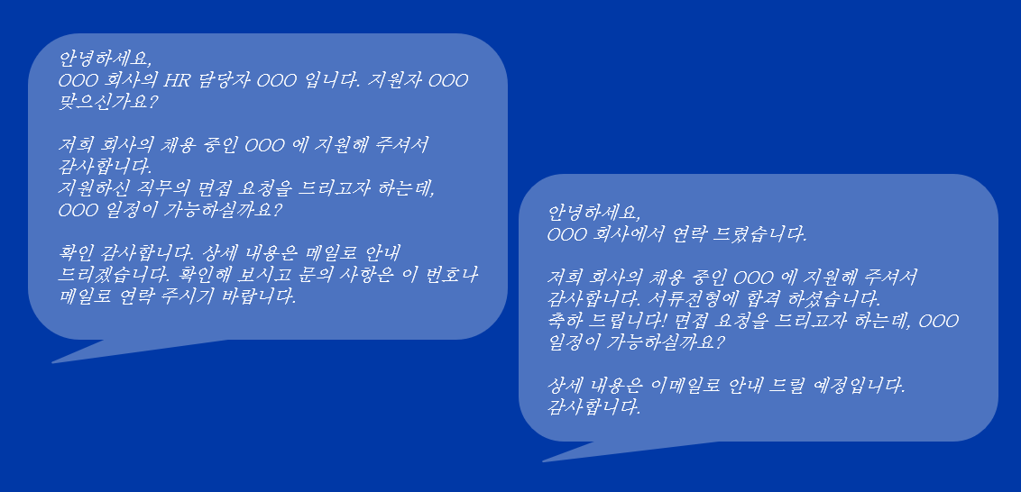 서류 전형 결과를 안내 함과 동시에, 면접 조율을 하는 과정에서 최초로 통화를 한다거나 개별 연락을 취하게 되며, 지원자 또한 추가 문의를 할 수 있는 개별 채널을 안내 받게 됩니다.