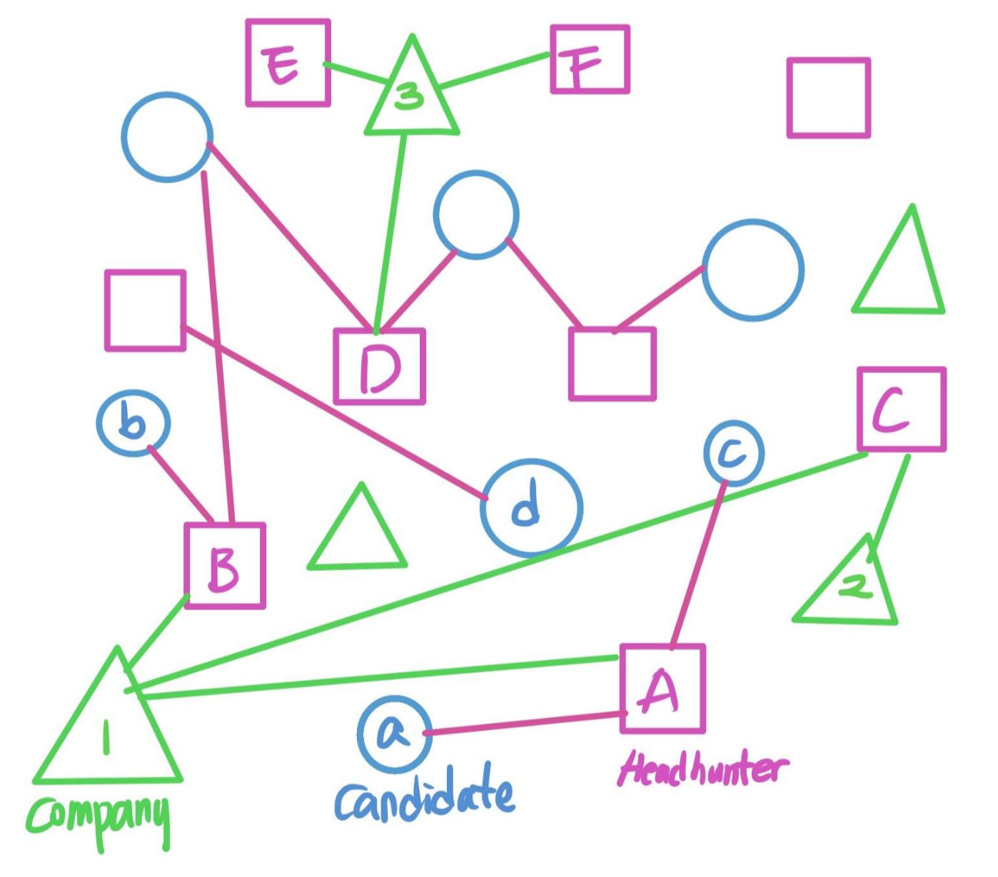 예를 들어 그림의 녹색 삼각형의 Company 1의 경우에는 보라색 사각형의 서치펌(헤드헌터라 적었네요) A, B, C와 계약이 되었다고 가정한다면, 지원자를 나타내는 파란색의 원형을 살펴 봤을때, Candidate a, b, c의 경우에 Company 1의 채용에 지원할 가능성이 생기는 것입니다.
