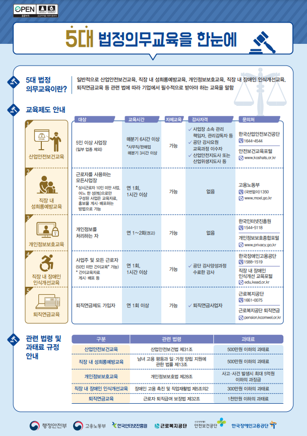 법정의무 교육이란 산업안전보건법, 남녀고용평등과일·가정양립지원에관한법률, 개인정보 보호법, 장애인 고용 촉진 및 직업재활법, 그리고 근로자 퇴직급여 보장법에 따라, 사업장에서 직원이 필수로 받아야 하는 교육을 칭합니다. 과거 4대 의무교육 시기부터 많은 혼란이 있다 보니, 최근에는 고용노동부에서 5대 법정의무교육을 아래와 같이 안내 하고 있습니다.