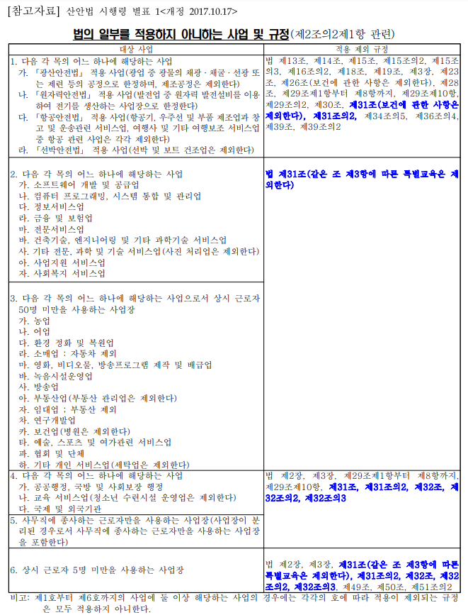 대부분은 관련 법령에 따라 모든 사업장에서 교육을 실시하도록 규정하고 있어, 법정 의무교육이라고 칭하고 있습니다. 다만, 산업안전보건교육 경우, 5인 미만 사업장 및 일부 업종을 제외하는데 그 업종이 아래와 같이 다양합니다.