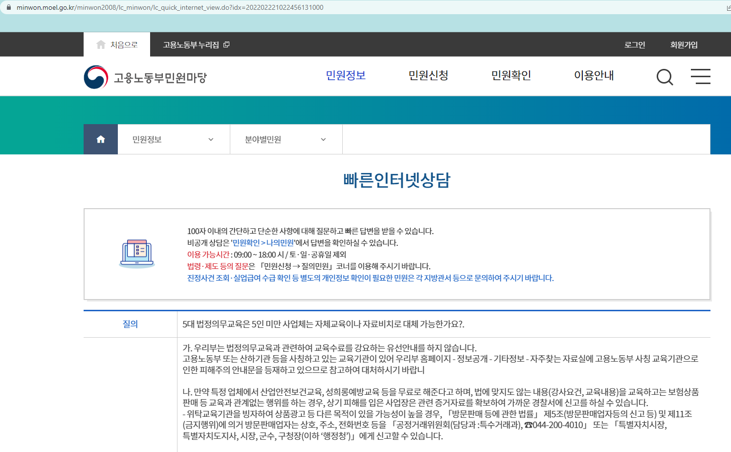 가령, 개인정보보호 교육이 과태료가 부과되는 교육이 아니니 필수가 아니라고 하고, 혹은 장애인 인식 교육 효력 발생 이전에 법령이 실효되지 않았다고 제외한 곳도 있습니다. 아래와 같이 고용노동부 홈페이지에서도, 5대 교육 문의에 따른 답변을 개인정보보호교육이 제외된 4대 교육으로 안내 하고 있습니다.