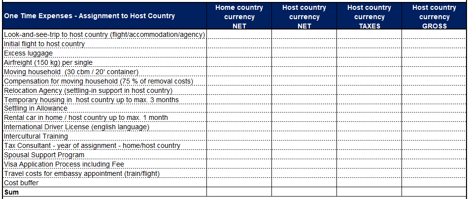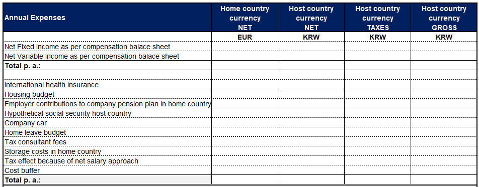 급여 항목 및 정착 지원금 등, 회사에서 지원되는 항목들의 모든 과세 금액을 표와 같이 정리해서 확인합니다. 나라별 소득세 등 세금 규모가 다르다 보니, 대부분의 expat 계약은 세후 금액을 고정으로 계약이 되는 경우가 많습니다. 대부분 외국인은 고정세율이 적용되다 보니, 세후 금액을 역산하여 회사의 비용 계획을 수립합니다. 관련 사항은 해외 본사에서 진행하는 경우도 있고, 혹은 PwC, 딜로이트 (Deliotte) 나 언스트앤영 (Ernst & Young) 등의 회계법인과 함께 업무하는 경우도 있습니다.