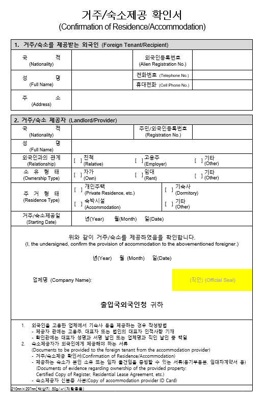 거주지가 미리 정해지지 않았다면, 단기 임대가 가능한 레지던스 같은 곳을 확보해서 아래와 같은 거주/숙소 제공 확인서를 제출해야 하니, 참고하시기 바랍니다.