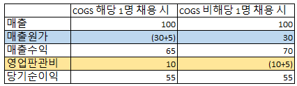즉, 회사에서 추가 1명을 채용 가능하다고 하는 경우, COGS 해당 직원은 비용적으로 관리 압박이 적은 형태로 채용이 가능하다고 해석할 수 있습니다. 요즘처럼 연말 비용 압박이 있는 경우 채용 방향에 대해 자주 논의하게 되는 부분 입니다.