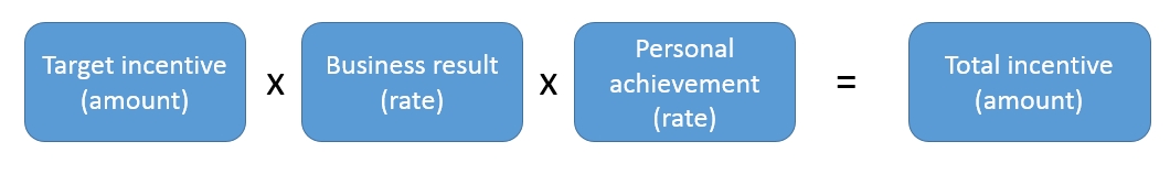 이 계산 방식의 경우, 회사의 실적과 개인의 실적이 다 좋다면 인센티브 금액이 크게 증가하지만, 반대로 회사 실적이나 개인 실적이 달성되지 않는 경우 인센티브가 아예 지급되지 않는 형태의 계산 방식도 있습니다. 회사와 개인의 성과가 좋을 때는 인센티브의 금액이 급증 하지만, 어느 하나라도 달성이 안된다면 인센티브가 아예 지급되지 않는 계산법 입니다.