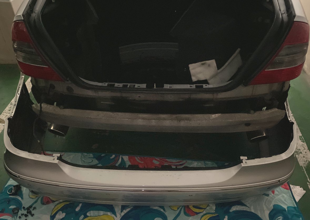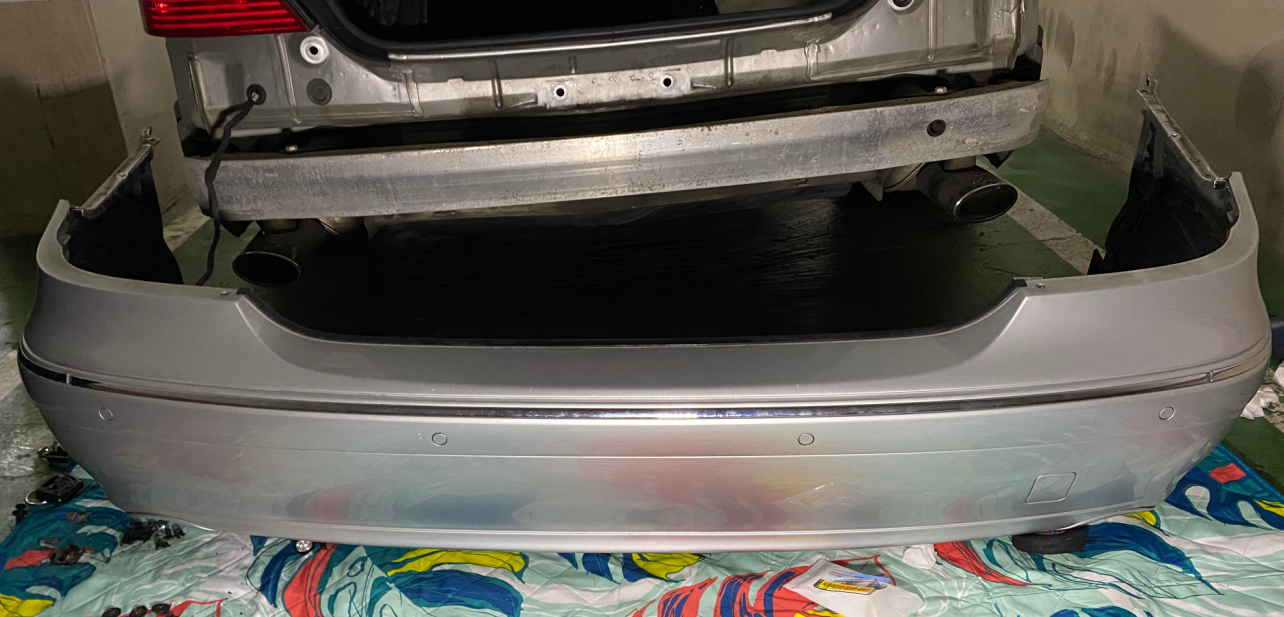 이제 양쪽 뒷바퀴부터 천천히 몸쪽으로 당기며 결합부를 분해해서 리어범퍼를 탈거했습니다. (감격!!)