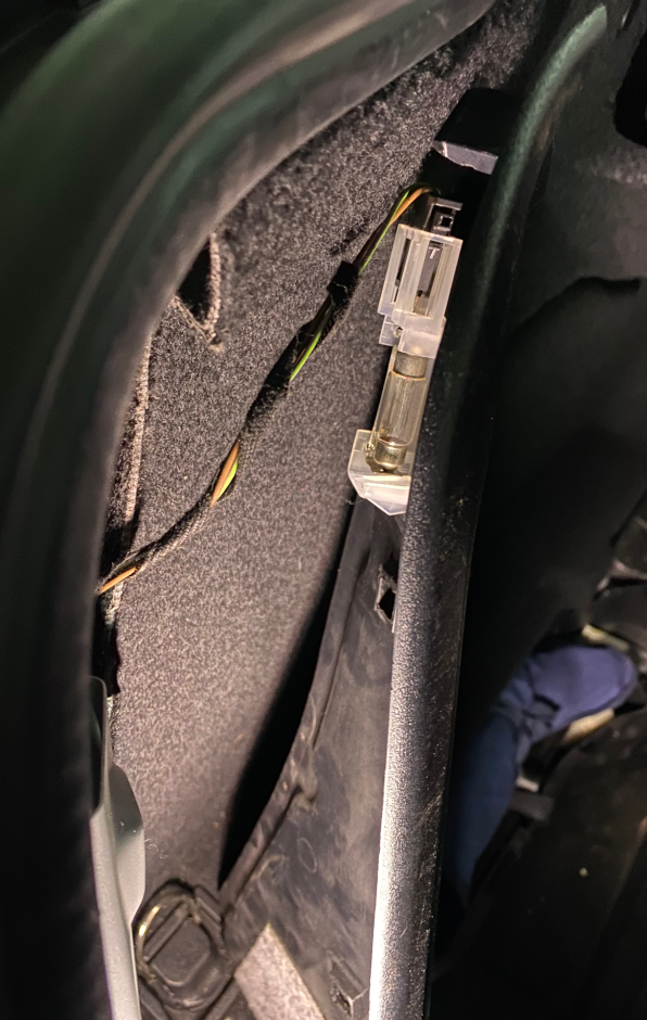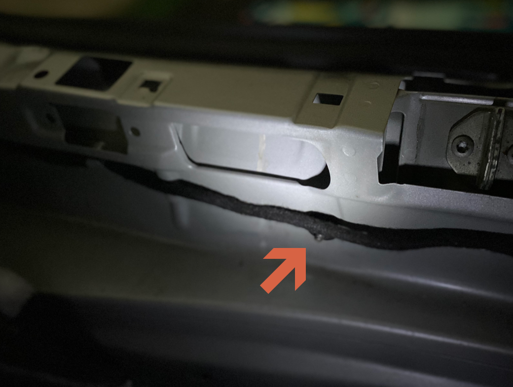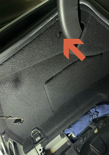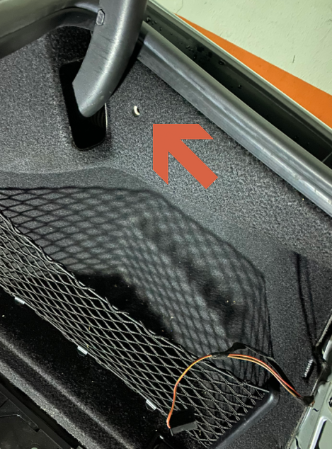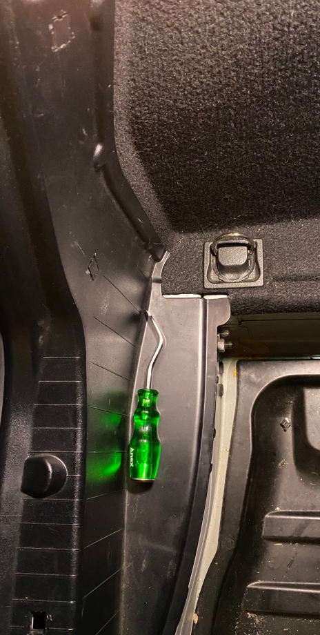 위 화살표가 있는 부근에, 트렁크 안쪽 방향으로 직사각형의 결합부가 있습니다. DIY 하시는 분들에게 유용한 저 갈고리 같은 도구가 상당히 편합니다. 트렁크 트림의 결합부를 제거하면, 양쪽 끝에 전구가 연결되어 있습니다. 간단히 선을 연결을 제거하거나, 전구 자체를 트림에서 제거해도 됩니다.