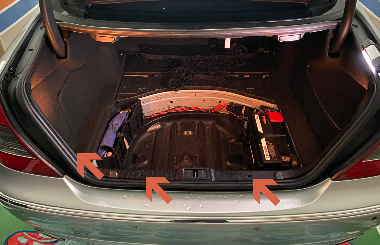 이제 다시 트렁크 내부에서 리어범퍼를 고정하는 너트를 풉니다. 와셔가 같이 달린 너트이며 총 4개가 있습니다. 그리고 테일램프 양쪽에 있는 너트도 같이 풉니다.