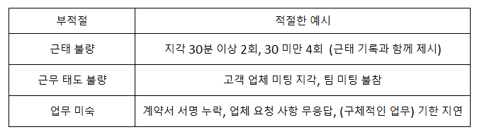 위와 같이 부적절한 사례가 제안되는 사례에 정답처럼 연결된다는 뜻은 아닙니다. 적절한 예시 내용 처럼 구체적이고 명확한 사례를 사유로 해당 근로자에게 해고 내용을 전달해야 한다는 의미 입니다.