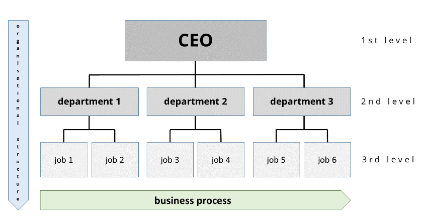 조직도의 개괄적인 형태를 아래와 같이 확인할 수도 있습니다. 세로로 단계가 나눠지는 부분은 조직 내 위치나 조직의 형태를 구분하고, 좌에서 우로 방향이 진행되는 부분은 사업의 형태를 반영하는 경우도 있습니다.