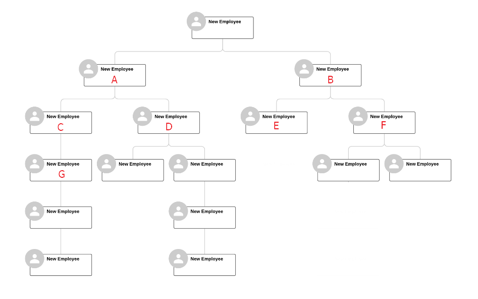 단순한 조직도 구성임에도, A와 B의 팀원 수를 판단할 때, A가 더 중요한 많은 책임 범위와 리더쉽을 요구하는 대상이라고 추측할 수 있습니다. 같은 제품을 판매하는 영업팀이라면, A팀의 매출이 더 많은 부분을 차지하고, 사업의 핵심 판매 루트를 담당하는 곳이라고도 생각할 수 있습니다. 그리고 B팀은 새로 진출하는 시장의 영업팀일 수도 있고, 신규 매니저가 담당하게 된 신생 팀으로도 추측할 수 있습니다. D와 F의 경우도, A와 B를 비교하는 것과 같은 의미로 생각할 수 있습니다.