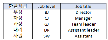 사원-대리-과장-차장-부장 등의 순으로, 한글직급 체계가 갖춰져 있고, 외국계에서 사용하는 Job level은 단지 한글직급을 영문으로 표기한 정도의 형태로 존재 합니다. 개인적으로는 각 한글 직급의 발음기호만 따서 영문으로 표시한 것으로 경험한 적이 있습니다.