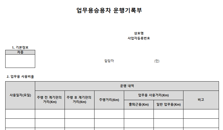 법인 차량의 경우, 운행 마일리지를 작성하는 것이 필수 사항으로, 각 차량에 대한 마일리 자료가 반드시 작성되어야 합니다. 운행 관리가 되고 있으며, 실제 업무용으로 사용되고 있다는 것을 증빙하기 위함으로서 아래와 같이 간단한 양식으로 작성되어도 무방 합니다. 과거 법인용 차량이 무분별하게 개인용도로 사용되는 것에 대해 검토하기 위해 생겨난 양식으로 알고 있습니다.