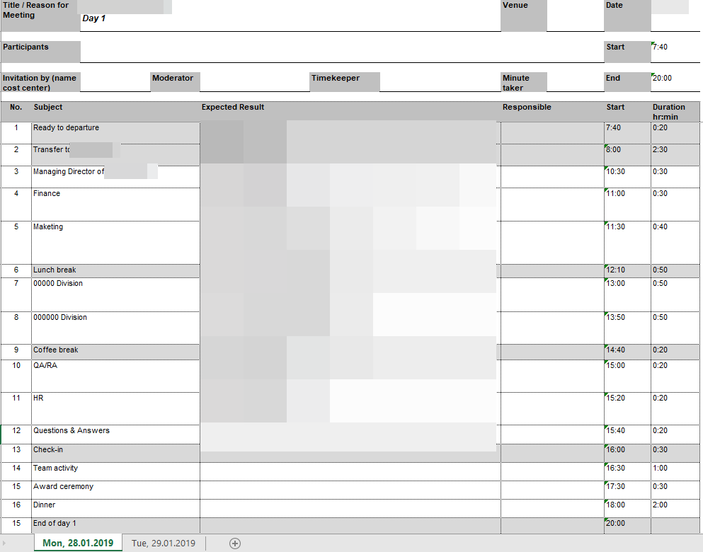 일정이 확정된다면, 관련하여 행사 진행 계획표를 논의 합니다. 어떤 주제로 행사를 진행하며, 참석 규모에 따라 어떤 장소가 필요한지에 대해서도 확인 합니다. 계획표에서 각 회의 진행 주제도 중요하지만, 행사를 진행하는 입장에서는 시작 시간, 종료 시간, 필요 장소 규모, 식사 여부 등의 내용들을 미리 파악하는 것이 더 중요 합니다.