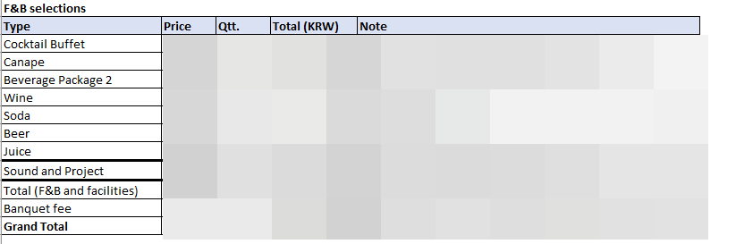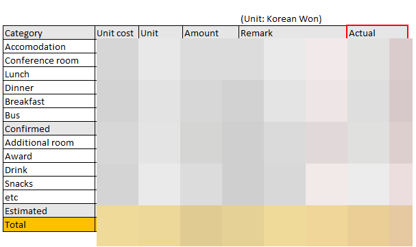 기존 행사로 사용된 예산이 있다면 유사한 범주 내에서 고려 가능하며, 처음 진행하는 행사라면 대략 인당 사용 금액을 산정하고 장소 대여 등 행사 내용에 맞는 예상치를 종합해 보고 후 예산 확정을 합니다. 빠지는 요소가 없는지 회사 내에서 확인 가능한 체크리스트나 양식 등을 적극 활용하여 행사 준비에 이상이 없도록 만전을 기합니다.