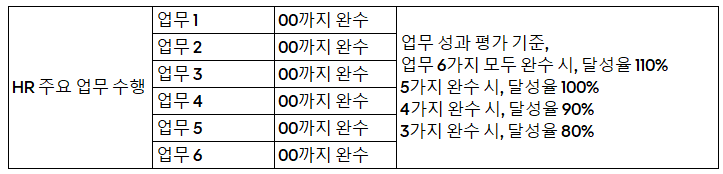 어쩌면 과거 MBO의 형태와도 비슷할 수도 있습니다. 정답은 없지만, 최소한 위 예시를 들었던 퇴직율이나, 입사율 등의 기준보다는 더욱 HR의 업무를 잘 반영한 목표 및 평가 기준이라 생각 합니다.