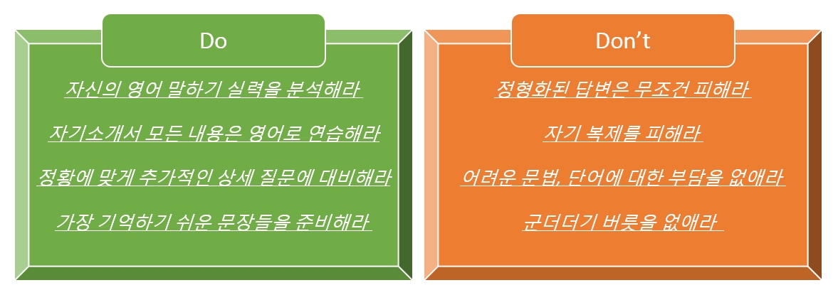 특히나, 자기소개서에 나와 있는 문장과 단어를 동일하게 암기하는 것이 아니라, 본인의 말하기 실력에 맞는 문장과 단어를 구성하여 약간 다르게 설명하는 것이 오히려 본인 영어 실력에 더 솔직히 어필하는 방법이라 생각 합니다.