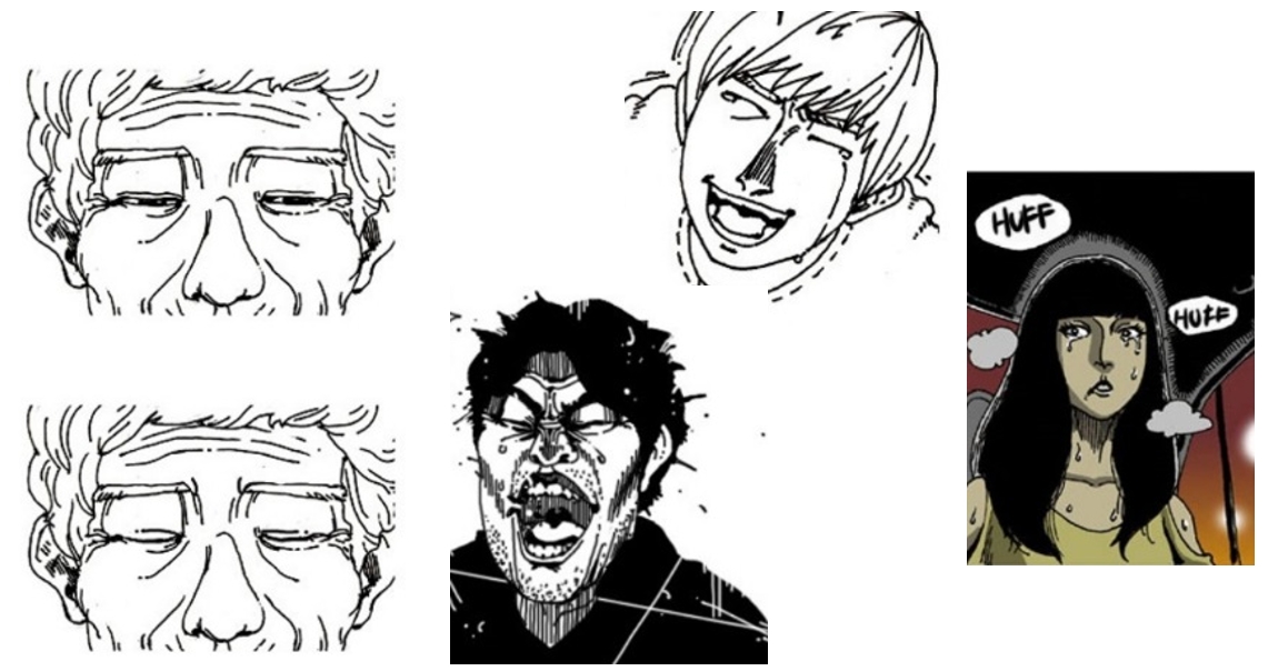 - angles (looking up/down/Going around like camera / hiding some parts to show the hidden parts) / stares to readers, no frames for each scenes, close up and fade away / parallel layout