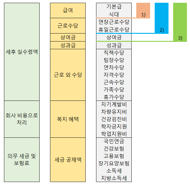 그림에서 보이는 1), 2), 3) 중 어떤 금액이 상여금 혹은 성과급의 기준이 되는 금액인지 꼭 확인하시기 바랍니다.