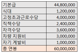 총 계약 연봉은 6000만원이며, 아래와 같은 내역이 포함되어 있다고 가정해 보겠습니다.