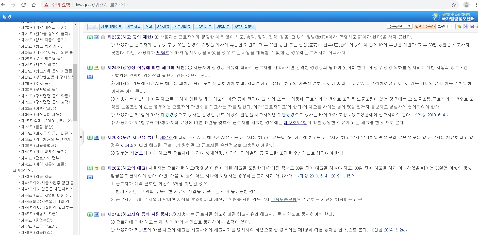 - '근로기준법 제 26조 (해고의 예고)'에서 언급된 사용자가 해고를 할 경우 30일 이전에 가능하다던지, 혹은 30일분의 급여를 줘야 한다는 내용
