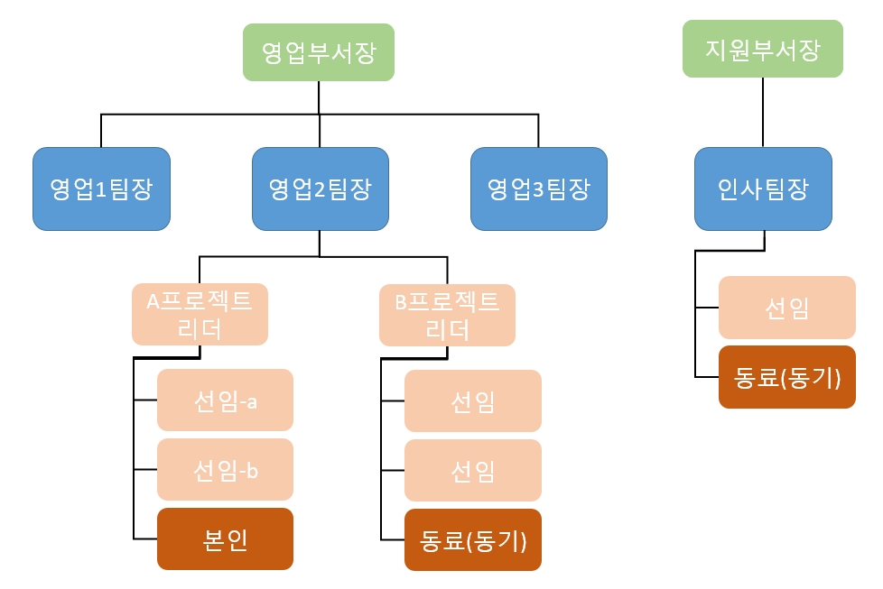 - 본인이 영업 부서의 영업2팀, A프로젝트에 속해 있다고 가정하겠습니다.