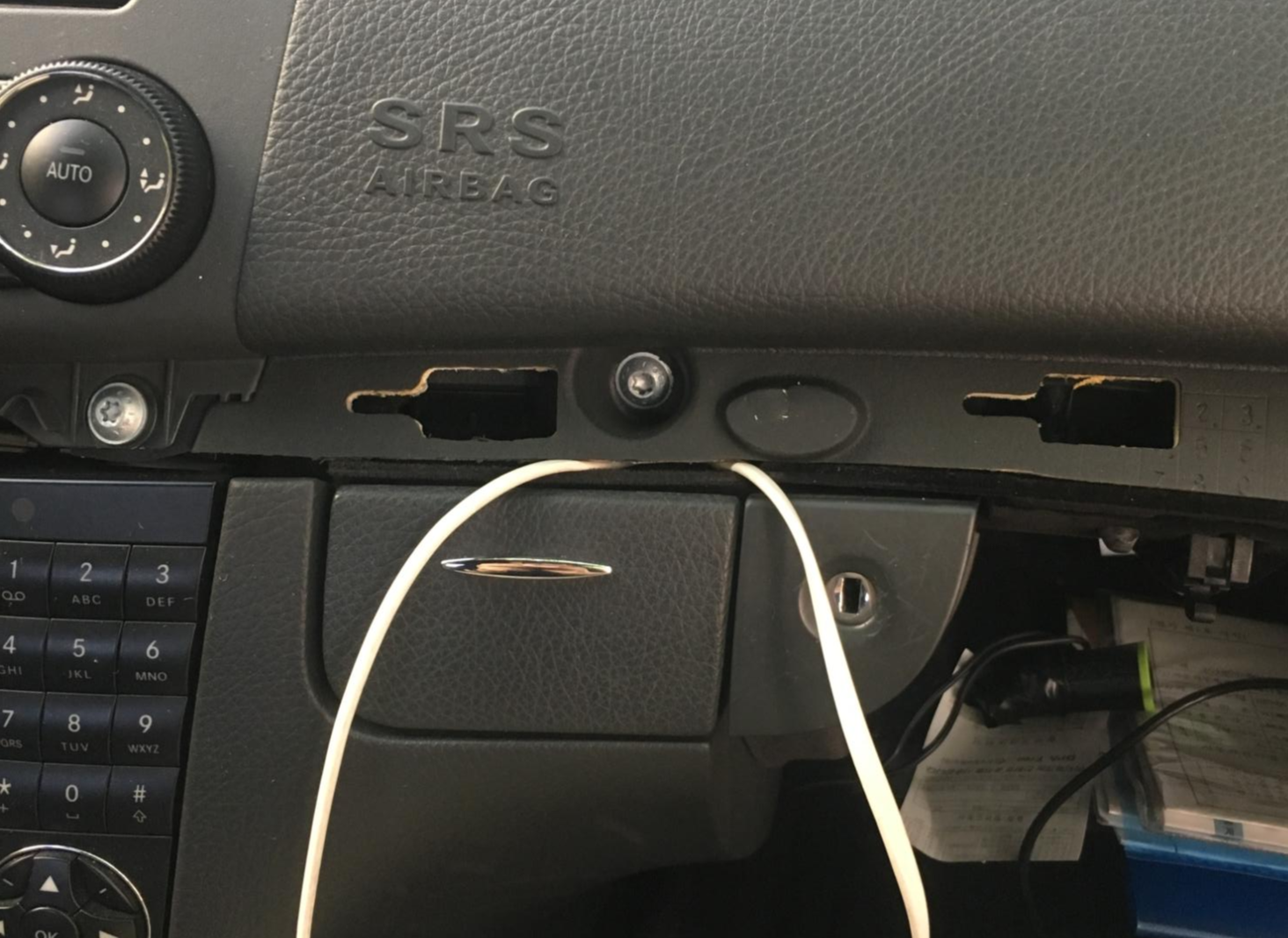 그 후, 핸드폰 충전선을 공간에 살짝 물려두고, 충전선이 나올 위치와, 글로브박스에 들어갈 위치를 잡아 봅니다.