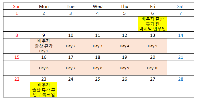- 변경되는 사항은 배우자 출산 휴가가 유급 10일이며, 이는 업무일 기준 10일이기에, 출산 휴가일 시작일이 월요일이라면, 출산 휴가 시작 전 주의 금요일 출근 후, 주말 포함 총 16일 휴가 이후 월요일에 다시 출근하게 됩니다.