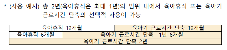 2. 육아기 근로시간 단축 제도 확대 : 육아휴직과 별도로 최대 1년 사용 가능, 육아휴직의 1년 중 미사용 기간을 육아기 근로시간 단축 제도로 전환하여 최대 2년까지 사용 가능, 육아기 근로시간 단축은 최소 3개월 단위로 무제한 분할 가능