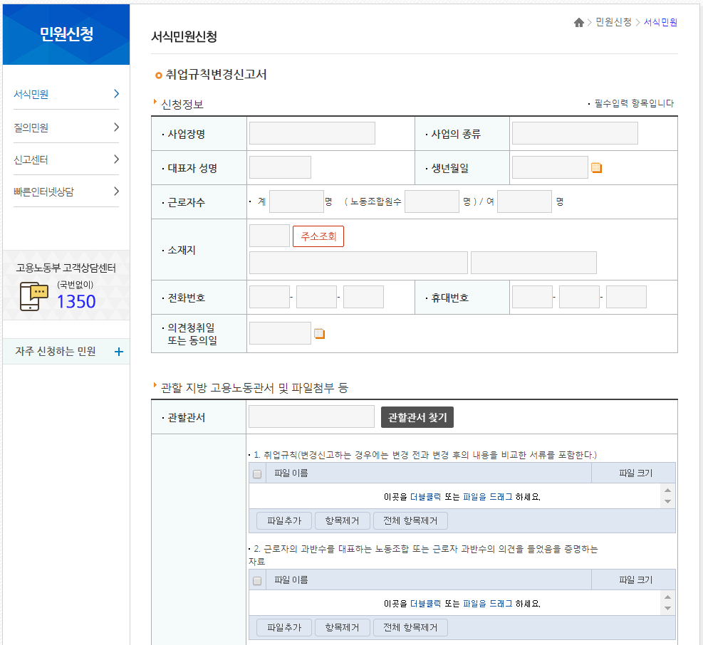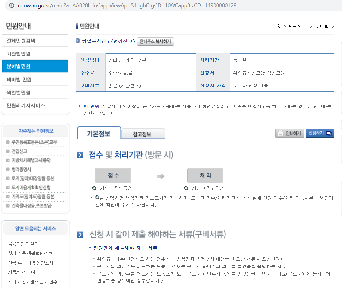 1. 취업규칙 변경 신고는 민원24를 통해서 인터넷 접수로 처리가 가능합니다.