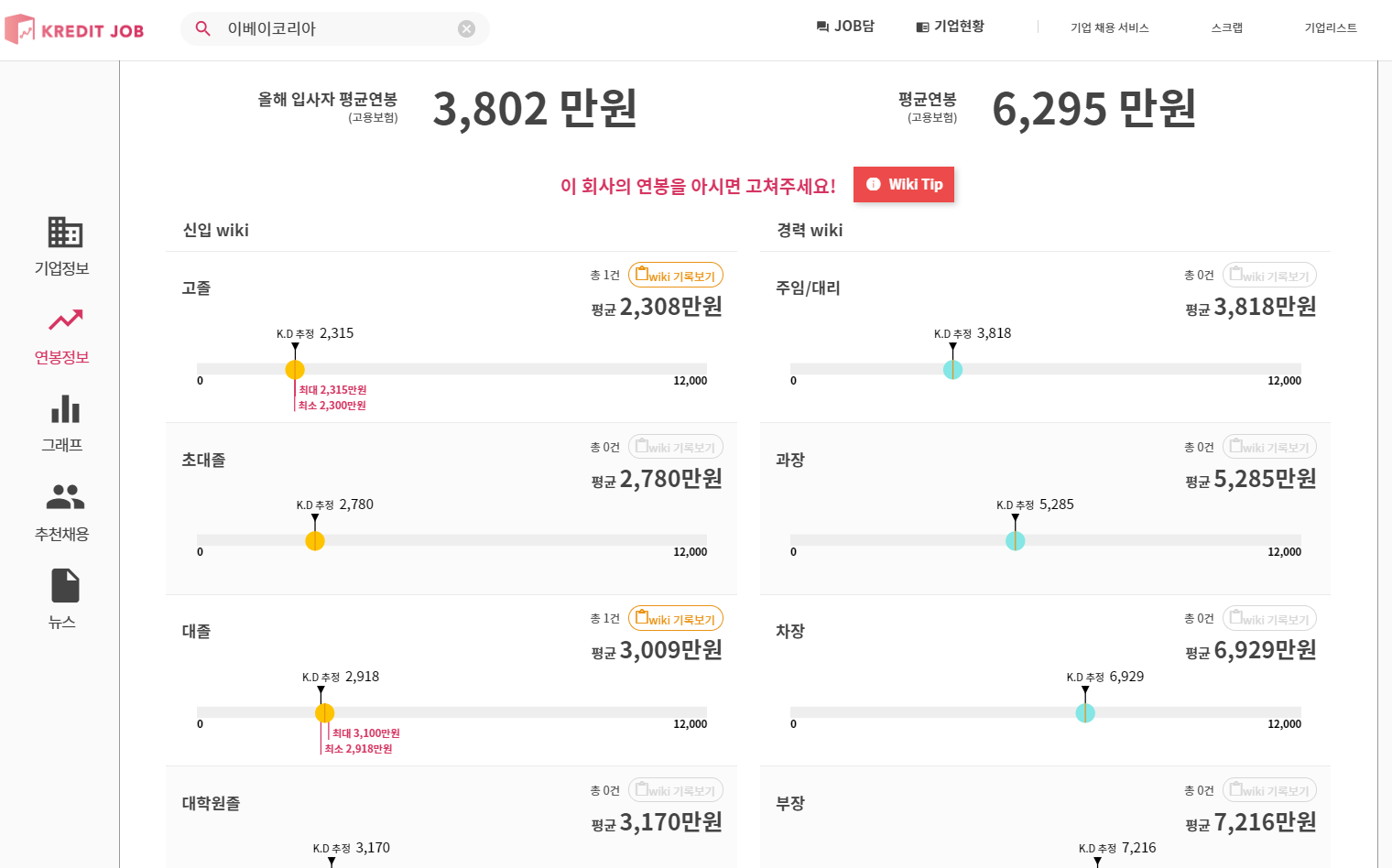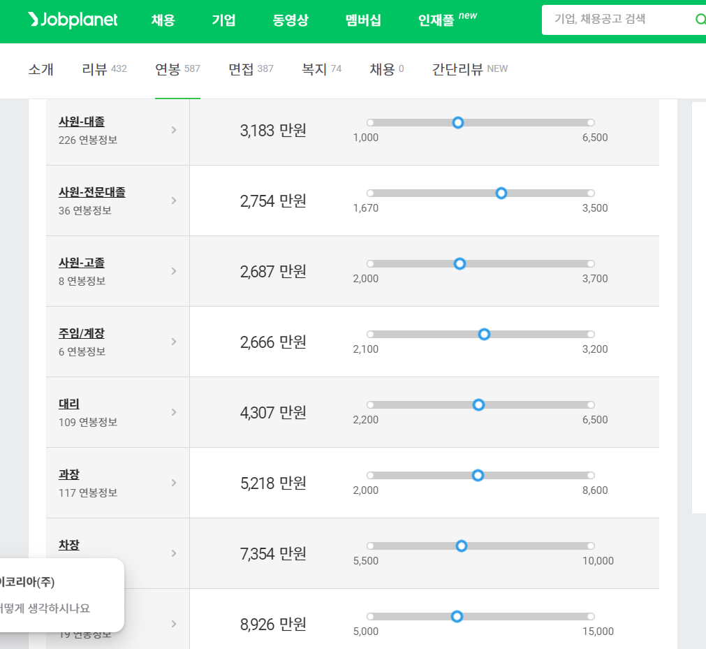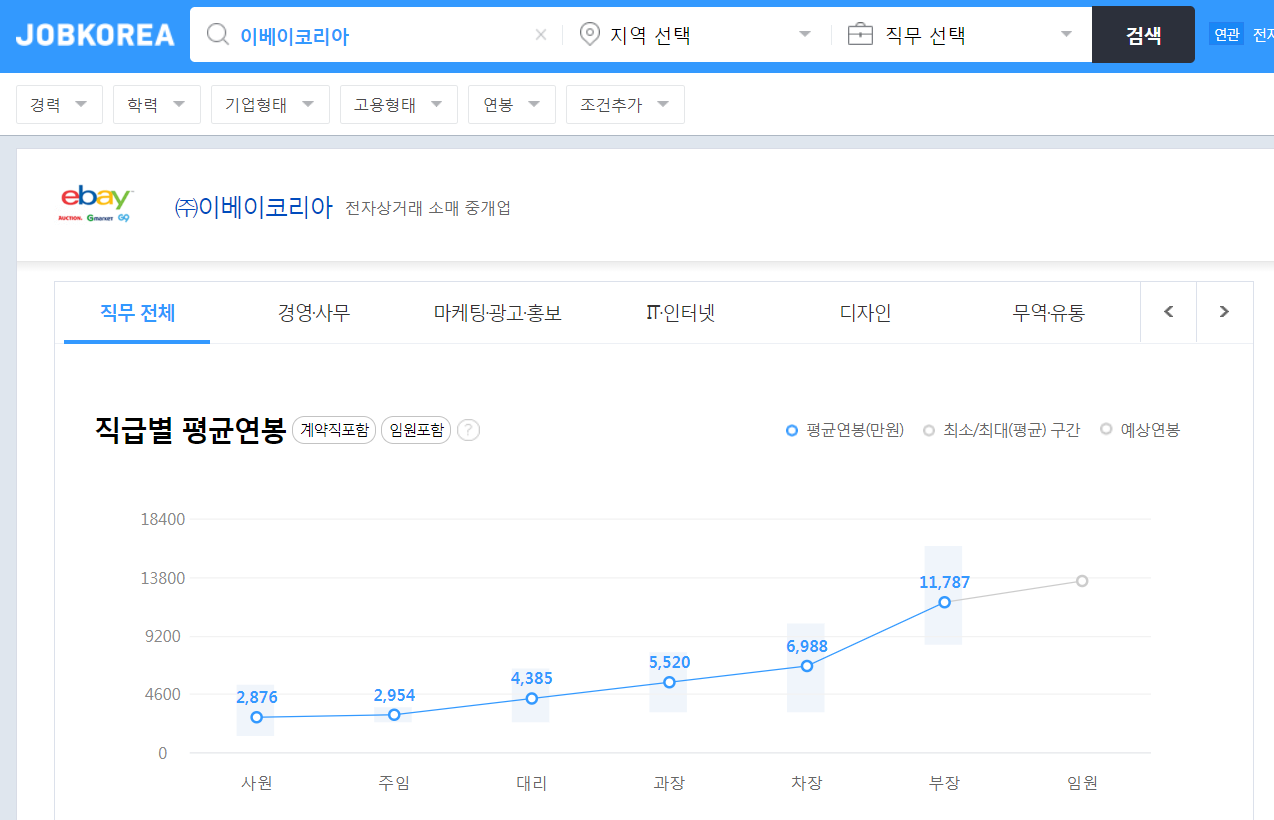 - 본인 연봉이 현직 회사, 이직 회사, 경쟁사, 직급별 어느 정도 위치 하는지 확인하세요. (유명 기업인 이베이코리아(주)를 예시로 살펴 보겠습니다.)
