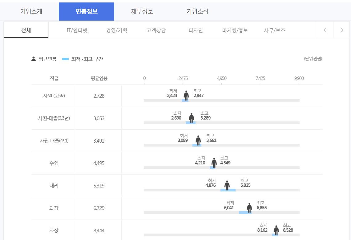 - 위 사이트 이외에도 취업 포탈 사이트인 잡코리아 및 사람인에서는 직무별 직급별 연봉 현황도 제공하고 있으므로, 본인이 현재 직급, 진급하는 직급, 이직하는 회사의 평균치 등에 대한 대략적인 확인이 가능합니다. (정말 부럽습니다...밀레니얼 세대들;;; 이런 정보가 그냥 막 튀어 나옵니다.)