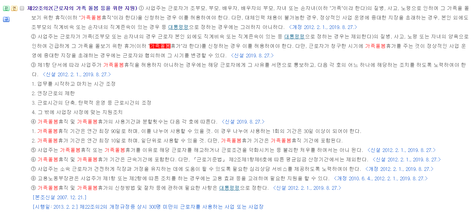 - 기존에는 부모, 배우자, 자녀 또는 배우자의 부모에만 대상자가 한정되어 있었으나, 이번 개정으로 조무보와 손자녀 또한 가족 돌봄 대상으로 확대 되었습니다. (기존에 한정이 있었다는 이유가 궁금합니다...)