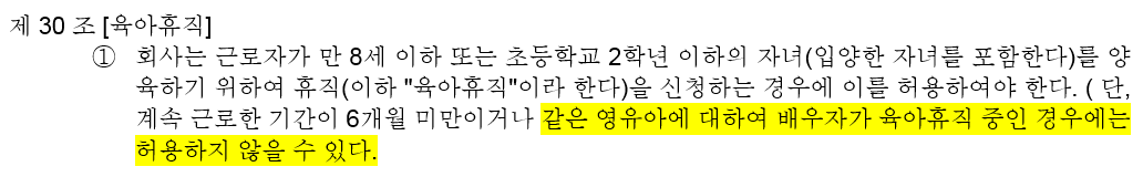 - 저희 취업규칙에서도, 아래와 같이 '같은 영유아에 대하여 배우자가 육아휴직 중인 경우에는 허용하지 않을 수 있다.'라고 되어 있네요. 이제 부부 동시 육아휴직이 허용되는 것이니 취업규칙에서 삭제될 부분 입니다.