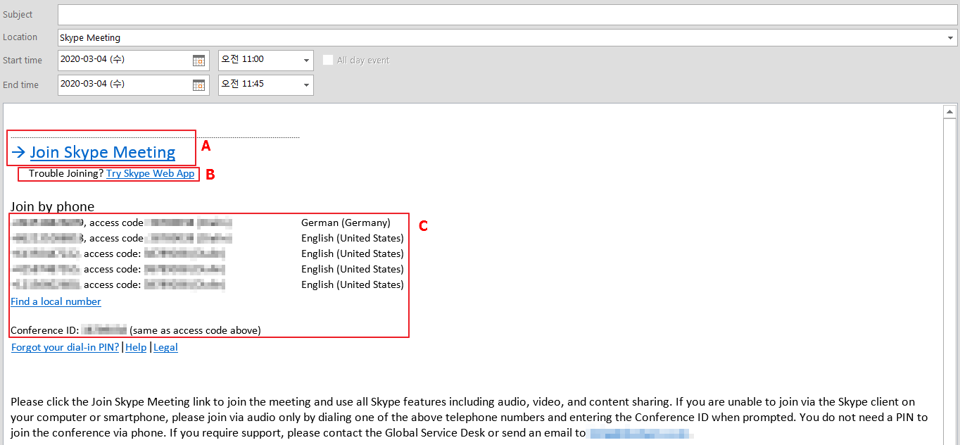 3) C의 경우는 전화를 걸어서 회의에 접속하는 경우인데, 스마트폰이 보급된 이후로는 잘 사용되지 않는 기능으로 생각 됩니다. 전화 접속은 해당 유선 번호로 전화를 걸면 access code와 Conference ID를 눌러서 접속하는 방식인데, 소리만 전달하는 방식이므로, 화상 면접에서는 사용되지 않습니다.