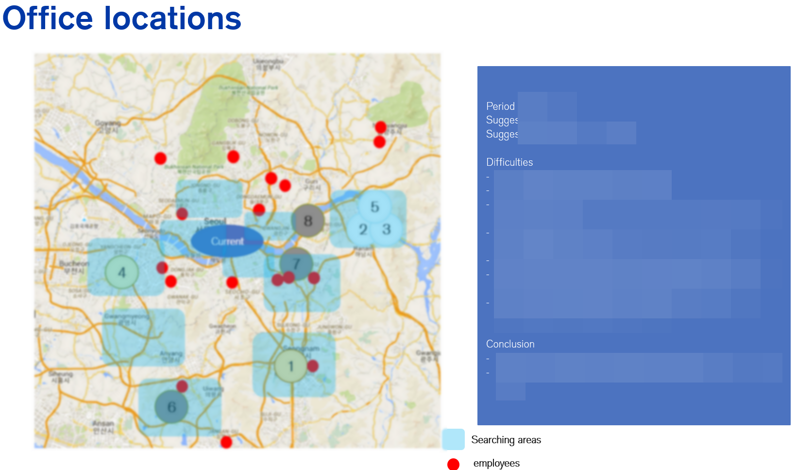 현재 사무실 위치를 중심으로, 확인한 매물들의 위치와 함께 참고 사항으로 직원들의 거주지 분포도 또한 논의 하는데 유용합니다.