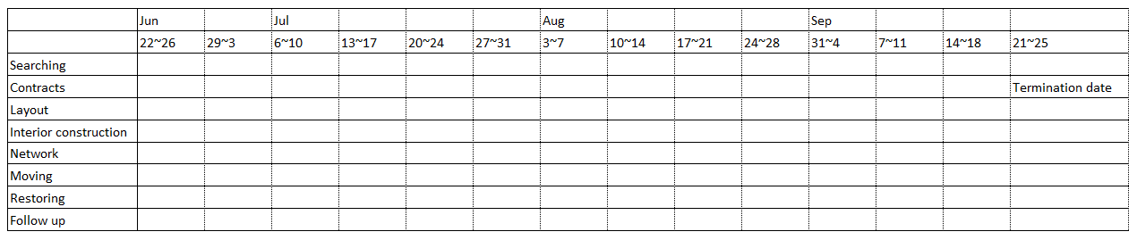 현재 사무실의 계약이 종료되는 시점을 확인하고, 특히 계약 종료 임대인과의 특별한 조건이 있는지 고려하여 이사 나가는 일정을 정해 두는 것이 좋습니다. 대부분 사무실은 이사 후 내부 공사한 부분을 원상 복구 하는 것이 조건으로 되어 있기에, 기존 가벽 등 구조물을 철거하는 기간을 규모에 따라 2~3주씩 고려를 해야 합니다.