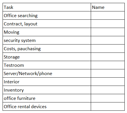 논의된 사항을 기반으로, 현재 사무실 면적에서 최소 얼마나 확장된 장소 및 어떤 조건들이 필요한지 작성한 내용이 있어야만 추후 부동산 서칭에 필요한 정보를 안내할 수 있습니다. 물론 가장 중요한 월 임대료 등도 가용 예산이 어느정도인지 여부를 미리 정해두고, 추가 절차에 대해 상세 계획 및 업무 분담이 필요합니다.