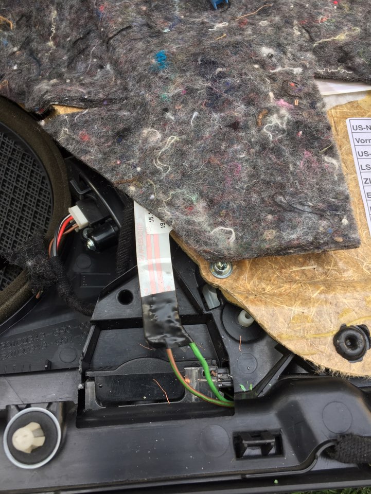 11) 분해한 문 내장재의 안쪽 모습 입니다. 분리한 3개의 전선이 보이고, 필름전선 파란색 단자 약간 아래쪽에 작업할 도어라이트가 보입니다.