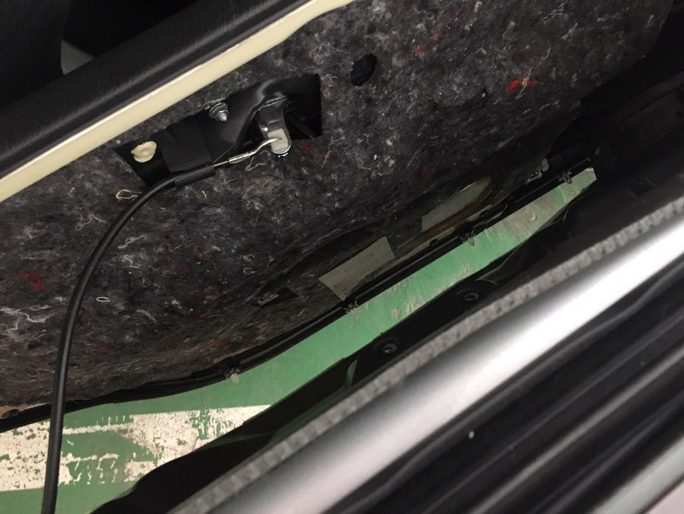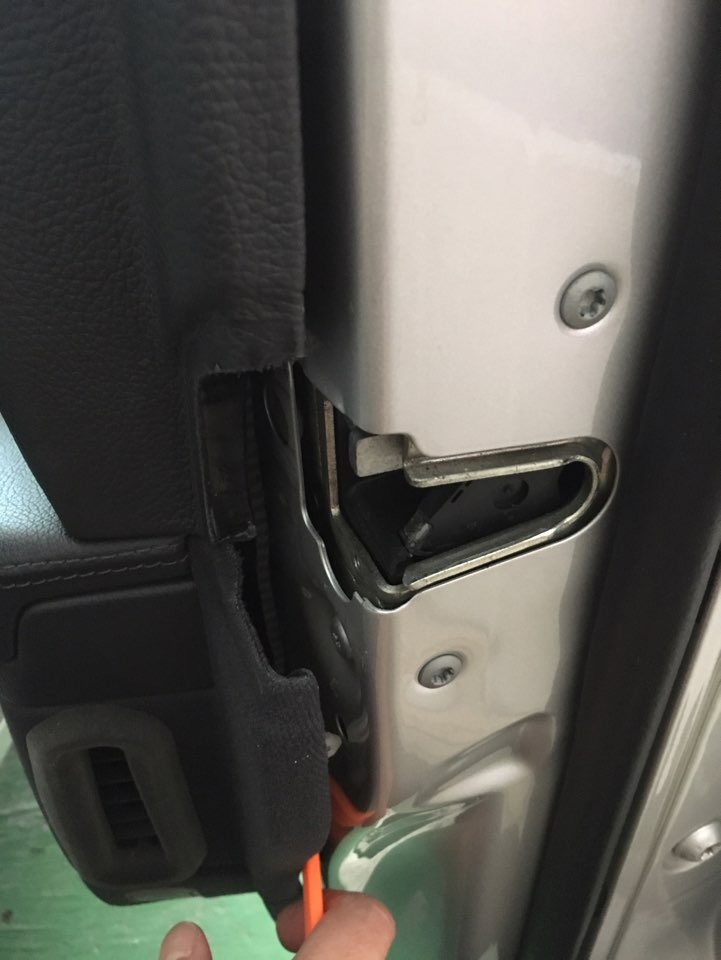 그림의 문열림 손잡에 걸려있는 와이어를 분해 합니다. 갈고리 같은 모양인데, 사진의 오른쪽 방향으로 당겨서 위쪽 방향으로 살짝 비틀어 빼주면 됩니다. 문 내장재를 잡고서 이 부분을 제거하는 게 약간 불편하긴 하던데, 이것도 여러번 하니 나중엔 요령이 생기더군요.