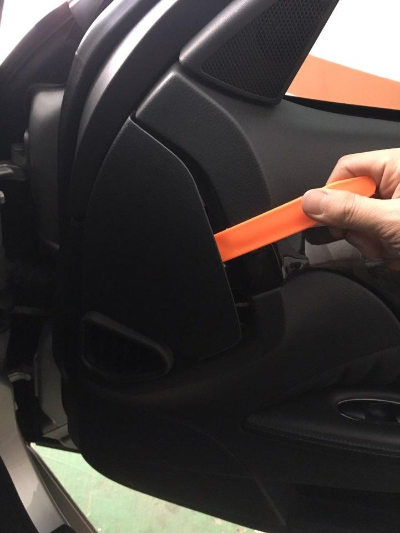 7) 트위터 아래 T25 1개, 문잠김 아래 T20 1개, 손잡이 아래 T25 2개 별나사를 다 분해 했다면, 문 안쪽 내장재가 결함된 부분은 모두 분해 되었습니다. 이제, 사진과 같은 도구를 이용해 문잠김 부분 쪽부터 지렛대 방식으로 내장재를 해체해 줍니다. 사진의 오렌지색 도구는 인터넷에서 구입한 플라스틱 DIY 도구(?) 같은 건데, 내장재에 손상 없이 해체가 가능하고, 의외로 사용 용도가 많아 구비해 두면 좋을 것 같습니다.