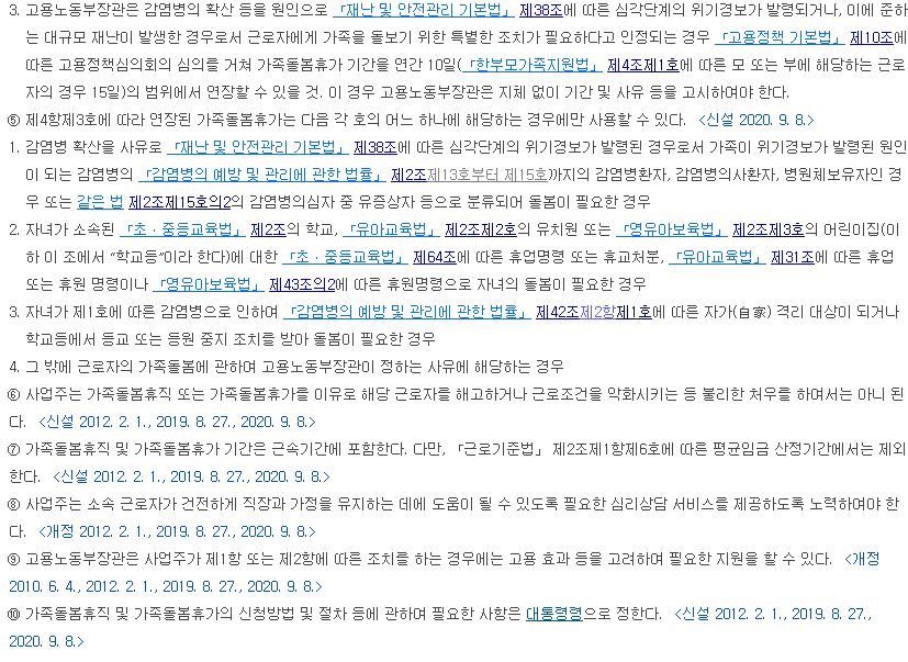- 사원이 조부모, 부모, 배우자, 자녀, 손자녀, 또는 배우자의 부모(이하 "가족"이라 한다)의 질병, 사고, 노령으로 인하여 그 가족을 돌보기 위한 휴직(이하 "가족돌봄휴직"이라 한다)을 신청하는 경우 휴직(무급)을 허용하여야 한다.