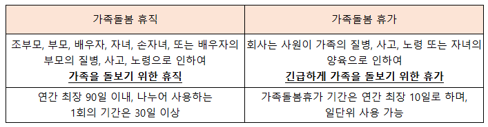 - 가족돌봄 휴가와 휴직은 약간 다른 내용입니다. 아래 간단한 비교 내역 확인하시기 바랍니다.